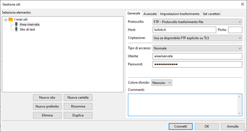 - Host: inserire ftp.nomedominio.ext (es. ftp.pippo.it)