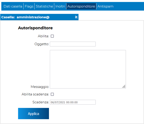 Dopo aver abilitato il servizio, tramite l'apposito flag, sarà possibile impostare l'oggetto e il messaggio di posta da inviare automaticamente all'arrivo di ogni email.