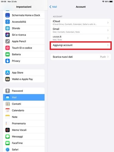 In Impostazioni selezionare la voce "Mail", successivamente "Account" e infine "Aggiungi account".