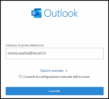 Inserire il proprio indirizzo di posta elettronica certificata, assicurandosi di selezionare la casella "Consenti la configurazione manuale dell'account" nelle Opzioni avanzate. Dopodichè premere "Connetti".