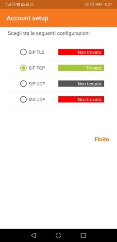 Procedere quindi toccando “Salta” per arrivare alla schermata successiva che controllerà l’esito dei dati inseriti precedentemente. Una volta terminato il controllo dei parametri il risultato sarà come nell’immagine sottostante, con la dicitura “SIP TCP” di colore verde. Toccare “Finito” per chiudere la configurazione di Zoiper ed iniziare ad usarlo.