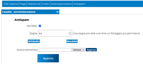 Occorrerà cliccare sull'ultima voce del menu superiore ("Antispam"), verificare che il servizio sia abilitato, e impostare un valore numerico tra 1 e 10.