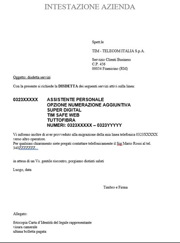 Per tutti gli altri operatori è possibile inviare la disdetta allegando una lettera su carta intestata aziendale, all’interno della quale dovranno essere riportati tutti i servizi da cessare, copiandoli esattamente come vengono indicati in fattura. Di seguito è possibile scaricare un modulo generico, da riportare su carta intestata ed utilizzare come base di partenza: Altri Operatori Modulo di Recesso (.doc)