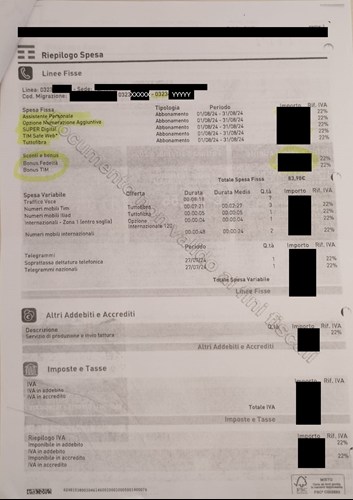 Di seguito riportiamo inoltre un esempio di fattura TIM, dove sono visibili i servizi e gli altri dati necessari per l'invio della disdetta.