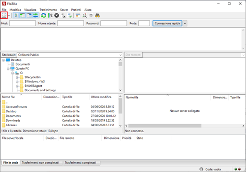 All'avvio il programma presenta una schermata come quella qui sotto. La prima cosa da fare è aprire il Gestore Siti, cliccando sulla prima icona in alto a sinistra.