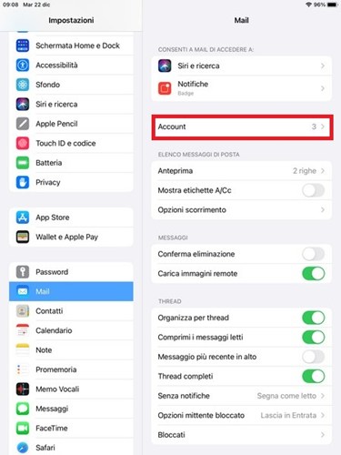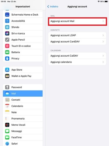 Per configurare il proprio account di posta su un iPad procedere come segue.