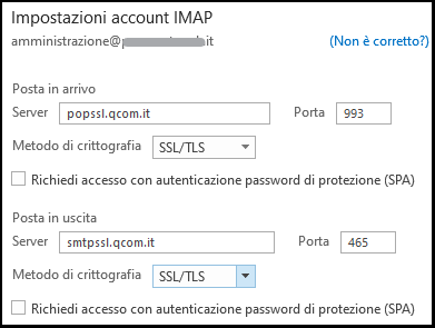 - Server posta in uscita (SMTP): smtpssl.qcom.it (con SSL attivo, autenticazione attiva e numero di porta 465)