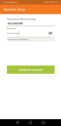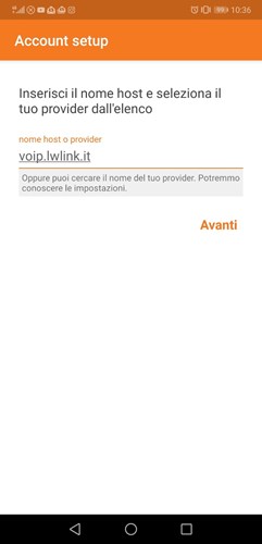 Una volta inseriti toccare il bottone “Create an account” per passare alla schermata successiva, nella quale verrà richiesto di inserire l’indirizzo host del server VoIP: inserire come nome host o provider il seguente link: voip.lwlink.it e toccare su “Avanti”.