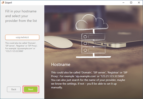 Una volta inseriti cliccare sul bottone con dicitura “Login” per passare alla schermata successiva, nella quale verrà richiesto di inserire l’indirizzo host del server VoIP: inserire come nome host o provider il seguente link: voip.lwlink.it e cliccare sul bottone con dicitura “Next”.