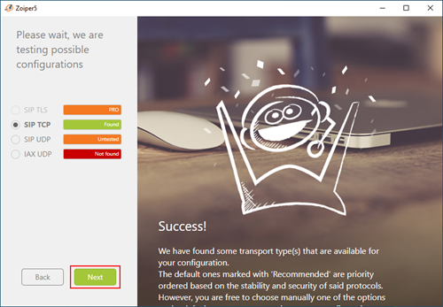 Procedere quindi cliccando sul bottone con dicitura “Skip” per arrivare alla schermata successiva che controllerà l’esito dei dati inseriti precedentemente. Una volta terminato il controllo dei parametri il risultato sarà come nell’immagine sottostante, con la dicitura “SIP TCP” di colore verde. Cliccare sul bottone con dicitura “Next” per chiudere la configurazione di Zoiper ed iniziare ad usarlo.